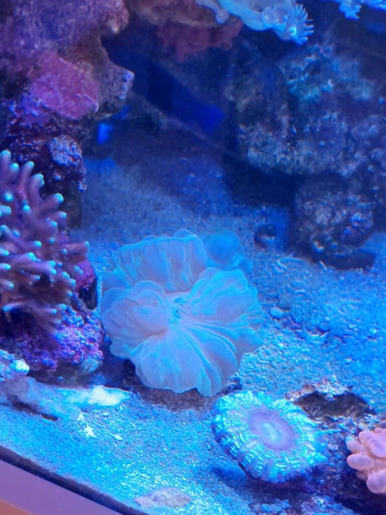 ここは少々注意が必要です。フォックスコーラルは強い水流を嫌います❌特に片側から強い水流が当たっていると、共肉がめくり上がりその部分だけが溶けていきますから、全体がほんのり揺れる程度の太く柔らかな水流を当てる必要があります。
